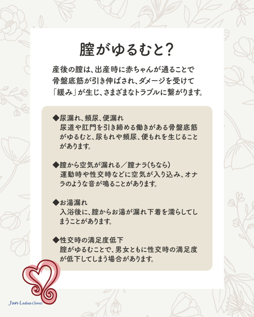産後の膣は、出産時に赤ちゃんが通ることで骨盤底筋が引き伸ばされ、ダメージを受けて「緩み」が生じ、さまざまなトラブルに繋がります。
