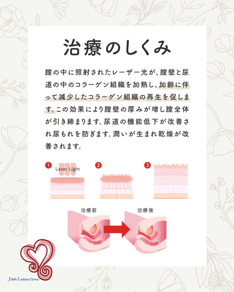尿道の機能低下が改善され尿もれを防ぎ、潤いも生まれ乾燥が改善されます。